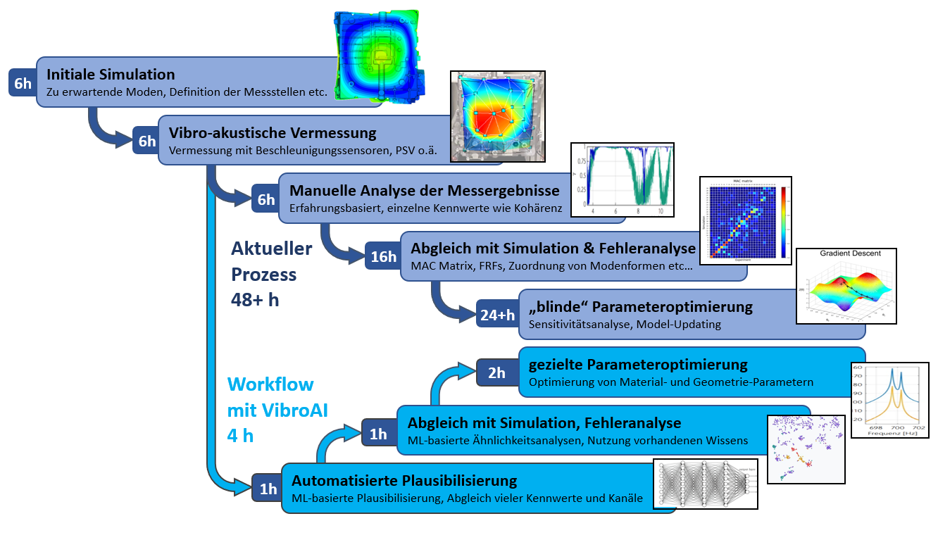 Innerhalb des Projekts VibroAI wurden (durch das Konsortium aus Renumics GmbH, INTES mbH und dem IPEK – Institut für Produktentwicklung am KIT) erstmalig maschinelle Lernverfahren (ML, auch engl. Machine Learning) eingesetzt, um vibroakustische Messdaten zu verarbeiten, mit Simulationsergebnissen zu vergleichen und Korrekturvorschläge für die Parametrierung der Simulationsmodelle zu generieren. Mithilfe des entwickelten Verfahrens kann der Zeitaufwand zur Validierung und Anpassung von Simulationsmodellen in vielen Automobil- und Maschinenbauanwendungen drastisch reduziert werden. Das entwickelte
